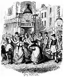 On one side, a little crowd has collected round a couple of ladies, who having imbibed the contents of various ‘three-outs’ of gin and bitters in the course of the morning, have at length differed on some point of domestic arrangement, and are on the eve of settling the quarrel satisfactorily, by an appeal to blows, greatly to the interest of other ladies who live in the same house, and tenements adjoining, and who are all partisans on one side or other.