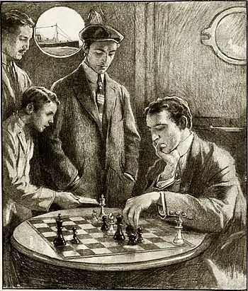 The wireless service is the last detail needed to give one the impression that the steamer is a great floating hotel. A steward comes to your room to deliver an aërogram written ashore a few minutes before, as any messenger-boy would look you up at home. If you are walking on deck, or lounging in the social-room or library, you are “paged” exactly as in a hotel. Meanwhile a bulletin, posted at the head of the main companionway or in the smoking-rooms, announces the latest weather forecast, the land station, and the various ships then in wireless communication. A little later, the daily newspaper will be published. A novel diversion of a transatlantic crossing, nowadays, is a game of chess or checkers played between passengers on two steamers hundreds of miles apart. The squares of the boards are numbered and the moves announced by simply telegraphing these numbers, when each move is made.