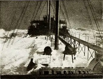 LOOKING DOWN FROM THE WIRELESS ROOM ON A FREIGHTER’S DECK DURING A HEAVY SEA.