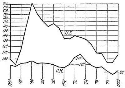 - ↑ King's figures (in terms of the average purchasing power of the dollar in the years 1890-99) for the successive census years from 1850 to 1910 are 69, 79, 82, 111, 169, 232, 262 (p. 129).