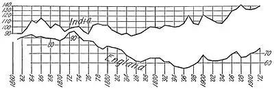 It will be noted that, in the first and last of these three periods, there is some similarity between English and Indian price movements, but that in the middle period there is little similarity.