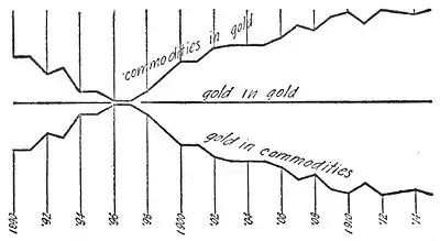- ↑ Cf. Bullock's Monetary History of the United States, N. Y, (Macmillan), 1900, p. 38; see also Irving Fisher, "The 'Scarcity' of Gold," Cotton and Finance, New York City, February 15, 1913. The recent attempts of the gold-mining interests in England and the United States to secure a Government subsidy utilized this illusion.