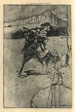 About half-way up the defile, when they had traversed it for about a quarter of an hour, Sheikh Hassan suddenly galloped forward and hurled his spear with great force at an isolated crag, the base of which was covered with oleanders, and then looking back he shouted to his companions. Tancred and the foremost hurried up to him.