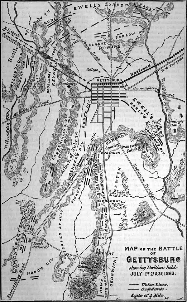 —July 1. On the morning of July 1 Hill, whose corps was in the advance, learned that Gettysburg, from which he was distant about 6 m., was occupied by a Union force. Sending back to urge Longstreet to hasten his march, he moved on. In the mean while Reynolds had sent out a cavalry reconnoissance in the direction whence Hill was coming, and the forces came in collision about 2 m. N. W. of Gettysburg. Reynolds sent infantry to the support of his cavalry, and the action opened. He was killed at the beginning of the fight, and the command here devolved upon Howard. At first the Union forces were superior, and they gained decided advantages, taking nearly 1,000 prisoners. But in a few hours nearly the whole of Hill's corps came up from Chambersburg, and Swell's from Carlisle, both numbering about 50,000, while their opponents were less than half as many. The Union force was driven back in confusion through Gettysburg, losing about 5,000 prisoners. The remainder took up a strong position on Culp's hill, just south of the town. The Union loss in this action was about 10,000, half of whom were killed and wounded. The confederate loss in killed and wounded was probably somewhat greater; in prisoners much less. Meade, who was 15 m. distant, had learned that there was fighting at Gettysburg, and sent Hancock with orders to take command of the force there, and to decide what should be done; for, as it happened, Meade knew nothing of Gettysburg. Hancock decided that this was the place to give battle, and sent back word to Meade to hurry all his troops to the place. Some of these came up during the night, others early in the following morning, and finally, after a march of 35 m., Sedgwick's corps in the afternoon. Lee had in the mean while suspended operations until he could bring up his whole army.—July 2. Early in the morning the bulk of the two armies was in position. Southward of Gettysburg, at the distance of a mile, rises Cemetery ridge. It curves first northward, then westward, and finally runs southward, the whole length being about 3 m., the shape being like a fish hook. It rises in places into several craggy hills, each having its own name. That on the extreme south, forming the stem of the fish hook, is Round Top, separated by a ravine from Little Round Top; at the bend of the hook is Cemetery hill; Culp's hill forms the barb. The Union army was posted along the whole line of Cemetery ridge. Opposite this is Seminary ridge, upon which the greater part of Lee's army was posted; Ewell's corps, however, lay at the foot of Culp's hill, 2 m. distant. The forces present or close at hand were about equal, each numbering from 70,000 to 80,000 infantry and artillery. Between the two ridges is a valley in which and on the slope of Cemetery ridge were fought the actions of July 2 and 3. It is clear from what followed that Lee greatly underestimated the force opposed to him, and he resolved to attack it in its strong position. Longstreet was to assail the Union left at Eound Top, while Ewell was to make on the right, at Gulp's hill, “a demonstration, to be converted into a real attack should opportunity offer.” Meade had intended that his line should be posted on the ridge directly between Round Top and Cemetery hill. But this ridge, in the centre where Sickles was placed, is comparatively low, sinking down into a valley a few hundred yards wide, beyond which rises another wooded crest running diagonally to the former; and Sickles supposed this to be the one which he was to occupy. Before the error could be corrected the confederate attack had begun, and Meade decided to support Sickles in his present position, although it left an unoccupied space between him and Round Top. As it happened, Hood's division of Longstreet's corps struck this opening. Moreover, by some mischance Little Round Top had been left unoccupied, and this was the key to the entire Union position; for if the enemy could seize this, and place a few guns upon it, the whole line would be enfiladed. The confederates perceived this, and began to swarm up the rugged sides. But just in time Warren, who as engineer was examining the line, discovered the error, and brought up a few regiments. They reached the summit just a moment ahead of the enemy, and forced them back. Again and again until nightfall the assault was unsuccessfully renewed. In the mean time the remainder of Longstreet's corps were pressing fiercely upon Sickles, who was soon borne from the field with his leg shattered. His corps made a stubborn resistance, but was forced back until it reached the crest of the ridge, where a new line was formed. The confederates charged this, but were met with a fire from which they recoiled. Hancock, who now commanded the centre, ordered a counter-charge, by which the enemy were driven back to the ridge previously occupied by Sickles, which they continued to hold. Swell's demonstration on the Union right was delayed until the action on the left was nearly over; but as most of the Union force had been withdrawn from Culp's hill to aid Sickles, he succeeded in effecting a lodgment within the Union intrenchments. The Union loss in this action was fully 10,000, half of which was in Sickles's corps, which lost nearly half its numbers. This action decided nothing; for the ground which the confederates had won on the Union left was never meant to be held by Meade, and he would gladly have withdrawn from it without a fight; and Swell's foothold on the Union right was of no importance unless it could be followed up. Still the confederates had gained some apparent advantages; and, says Lee, “These partial successes determined me to continue the assault the next day.” From what he could then know, he was justified in this; for he had every reason to suppose that he had encountered the entire Union force, while less than half of his own had been engaged.—July 3. Lee's general plan of attack was similar to that of the preceding day. Ewell 