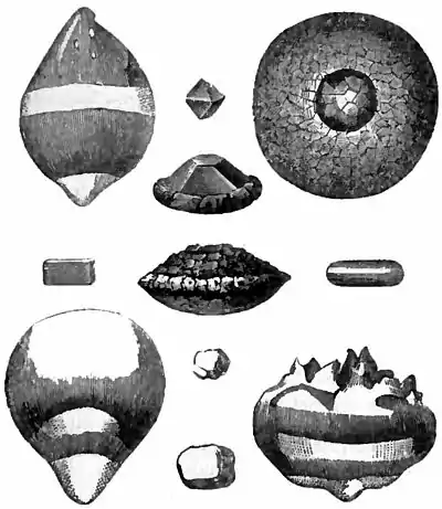 HAIL, the aqueous vapor of the atmosphere congealed in icy masses, called hailstones, and precipitated upon the earth. Hailstones vary in size and internal structure, from the homogeneous masses one eighth of an inch in diameter forming sleet, to the larger masses 3 in. in diameter, of beautiful crystalline structure, and to the still larger accretions of these masses sometimes a foot or more in diameter. The crystalline structure of most hailstones is remarkably distinct. The centre of the hail is a collection of semi-translucent granules or a spongy mass of snow and opaque ice; surrounding this nucleus is a more or less well defined radiated structure of crystals of ice; a large quantity of air is always enclosed within the interstices of the hailstone. Occasionally the stones are composed of concentric rings of ice and snow; when they consist of clear ice without the snowy nucleus, there is almost invariably found in the centre, in place of the nucleus, a cavity filled with condensed air; from experiments made in 1871 it has been shown that this bubble of enclosed air is subjected to a pressure of many atmospheres. Small bits of dust, leaves, and other foreign particles are occasionally found in the interior of the mass of a hailstone, and crystals of sulphur as well as ashes are particularly observed when the hail storm occurs in a volcanic region.