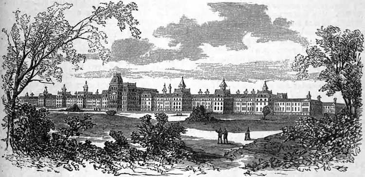 About 3 m. from the village a new state insane asylum, one of the largest and best arranged in the country, is in course of erection. It is to be completed early in 1875, and with site and equipments will cost about $2,000,000. The grounds embrace 408 acres. The entire length of the building is 1,243 ft., and the depth, from the front of the main centre to the rear of the extreme wing, 542 ft. The wings on the right and left of the centre building are three stories high, except those at the extreme ends, which are two stories. It is built principally of light granite quarried on the grounds, in ornamental style, and will accommodate about 1,000 patients.