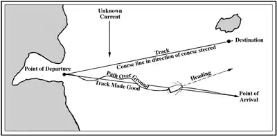 Track (TR) is the intended horizontal direction of travel with respect to the Earth. The terms intended track and trackline are used to indicate the path of intended travel. See Figure 107a. The track consists of one or a series of course lines, from the point of departure to the destination, along which one intends to proceed. A great circle which a vessel intends to follow is called a great-circle track, though it consists of a series of straight lines approximating a great circle