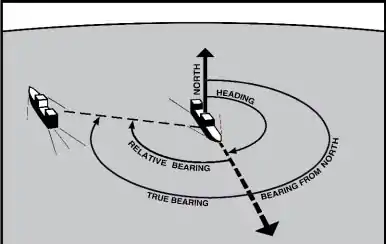 Bearing (B, Brg.) is the direction of one terrestrial point from another, expressed as angular distance from 000° (North) clockwise through 360°. When measured through 90° or 180° from either north or south, it is called bearing angle (B). Bearing and azimuth are sometimes used interchangeably, but the latter more accurately refers to the horizontal direction of a point on the celestial sphere from a point on the Earth. A relative bearing is measured relative to the ship’s heading from 000° (dead ahead) clockwise through 360°. However, it is sometimes conveniently measured right or left from 000° at the ship’s head through 180°. This is particularly true when using the table for Distance of an Object by Two Bearings.