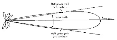 A radar beam’s horizontal and vertical beam widths are referenced to arbitrarily selected power limits. The most common convention defines beam width as the angular width between half power points. The half power point corresponds to a drop in 3 decibels from the maximum beam strength.