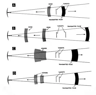 - Resolution in Range. In part A of Figure 1306a, a transmitted pulse has arrived at the second of two targets of insufficient size or density to absorb or reflect all of the energy of the pulse. While the pulse has traveled from the first to the second target, the echo from the first has traveled an equal distance in the opposite direction. At B, the transmitted pulse has continued on beyond the second target, and the two echoes are returning toward the transmitter. The distance between leading edges of the two echoes is twice the distance between targets. The correct distance will be shown on the scope, which is calibrated to show half the distance traveled out and back. At C the targets are closer together and the pulse length has been increased. The two echoes merge, and on the scope they will appear as a single, large target. At D the pulse length has been decreased, and the two echoes appear separated. The ability of a radar to separate targets close together on the same bearing is called resolution in range. It is related primarily to pulse length. The minimum distance between targets that can be distinguished as separate is half the pulse length. This (half the pulse length) is the apparent depth or thickness of a target presenting a flat perpendicular surface to the radar beam. Thus, several ships close together may appear as an island. Echoes from a number of small boats, piles, breakers, or even large ships close to the shore may blend with echoes from the shore, resulting in an incorrect indication of the position and shape of the shoreline.