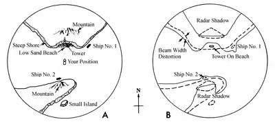 - The radar shadow behind both mountains. Distortion owing to radar shadows is responsible for more confusion than any other cause. The small island does not appear because it is in the radar shadow.