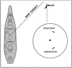 Indirect or false echoes are caused by reflection of the main lobe of the radar beam off ship’s structures such as stacks and kingposts. When such reflection does occur, the echo will return from a legitimate radar contact to the antenna by the same indirect path. Consequently, the echo will appear on the PPI at the bearing of the reflecting surface. As shown in Figure 1307a, the indirect echo will appear on the PPI at the same range as the direct echo received, assuming that the additional distance by the indirect path is negligible.