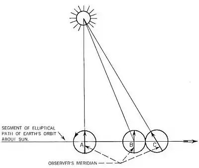 See Figure 1800. If the Sun is on the observer’s meridian when the Earth is at point A in its orbit around the Sun, it will not be on the observer’s meridian after the Earth has rotated through 360° because the Earth will have moved along its orbit to point B. Before the Sun is again on the observer’s meridian, the Earth must turn a little more on its axis. The Sun will be on the observer’s meridian again when the Earth has moved to point C in its orbit. Thus, during the course of a day the Sun appears to move eastward with respect to the stars.