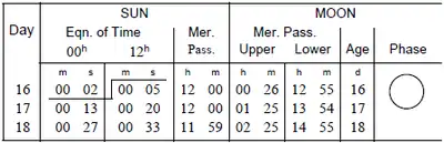 Solution: See Figure 2008 in Chapter 20, the Nautical Almanac’s right hand daily page for June 16, 1994. The equation of time is listed in the bottom right hand corner of the page. There are two ways to solve the problem, depending on the accuracy required for the value of meridian passage. The time of the Sun at meridian passage is given to the nearest minute in the “Mer. Pass.”column. For June 16, 1994, this value is 1201.