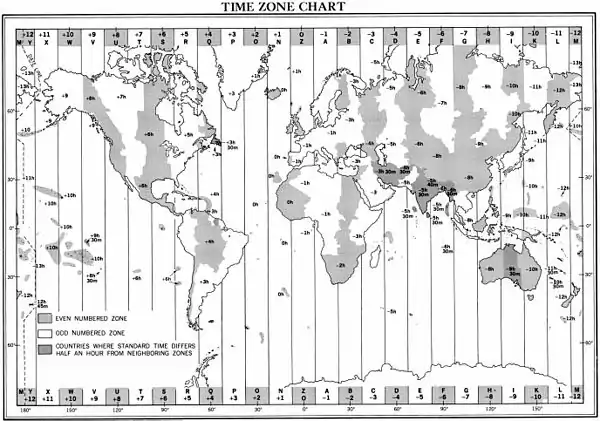 At sea, as well as ashore, watches and clocks are normally set to some form of zone time (ZT). At sea the nearest meridian exactly divisible by 15° is usually used as the time meridian or zone meridian. Thus, within a time zone extending 7.5° on each side of the time meridian the time is the same, and time in consecutive zones differs by exactly one hour. The time is changed as convenient, usually at a whole hour, when crossing the boundary between zones. Each time zone is identified by the number of times the longitude of its zone meridian is divisible by 15°, positive in west longitude and negative in east longitude. This number and its sign, called the zone description (ZD), is the number of whole hours that are added to or subtracted from the zone time to obtain Greenwich Mean Time (GMT). The mean Sun is the celestial reference point for zone time. See Figure 1806.
