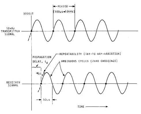 Consider a very simple system consisting of an unmodulated 10-kHz signal as shown in Figure 1813. This signal, leaving the transmitter at 0000 UTC, will reach the receiver at a later time equivalent to the propagation delay. The user must know this delay because the accuracy of his knowledge of time can be no better than the degree to which the delay is known. Since all cycles of the signal are identical, the signal is ambiguous and the user must somehow decide which cycle is the “on time” cycle. This means, in the case of the hypothetical 10-kHz signal, that the user must know the time to ± 50 microseconds (half the period of the signal). Further, the user may desire to use this system, say once a day, for an extended period of time to check his clock or frequency standard. However, if the delay varies from one day to the next without the user knowing, accuracy will be limited by the lack of repeatability.