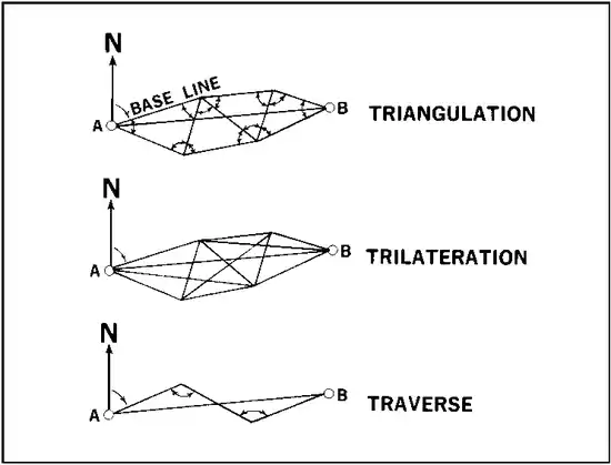 Trilateration involves measuring the sides of a chain of triangles or other polygons. From them, the distance and direction from A to B can be computed. Figure 206 shows this process.