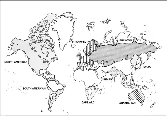 The origin of the European Datum is at Potsdam, Germany. Numerous national systems have been joined into a large datum based upon the International Ellipsoid of 1924 which was oriented by a modified astrogeodetic method. European, African, and Asian triangulation chains were connected, and African measurements from Cairo to Cape Town were completed. Thus, all of Europe, Africa, and Asia are molded into one great system. Through common survey stations, it was also possible to convert data from the Russian Pulkova, 1932 system to the European Datum, and as a result, the European Datum includes triangulation as far east as the 84th meridian. Additional ties across the Middle East have permitted connection of the Indian and European Datums.