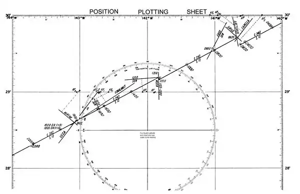 A navigator often takes sights of more than one celestial body when determining a celestial fix. After plotting the lines of position from these several sights, advance the resulting LOP’s along the track to the time of the last sight and label the resulting fix with the time of this last sight.