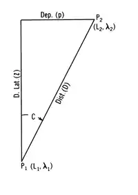 From this, given course and distance (C and D), the difference of latitude (l) and departure (p) can be found, and given the latter, the former can be found, using simple trigonometry. See Chapter 24. - Traverse sailing combines plane sailings with two or more courses, computing course and distance along a series of rhumb lines. See Chapter 24.