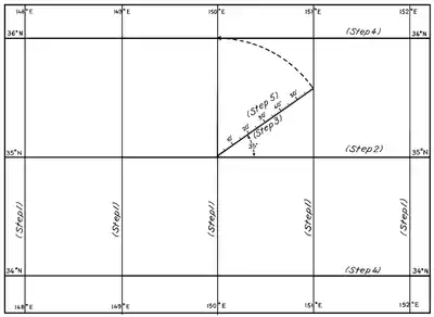 Step four: Draw in and label additional parallels. The length of the oblique line between meridians is the perpendicular distance between parallels, as shown by the broken arc. The number of minutes of arc between parallels is the same as that between the meridians.