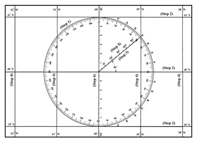 Step one: At the center of the sheet draw a circle with a radius equal to 1° (or any other convenient unit) of latitude at the desired scale. If a sheet with a compass rose is available, as in Figure 2603b, the compass rose can be used as the circle and will prove useful for measuring directions. It need not limit the scale of the chart, as an additional concentric circle can be drawn, and desired graduations extended to it.