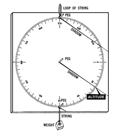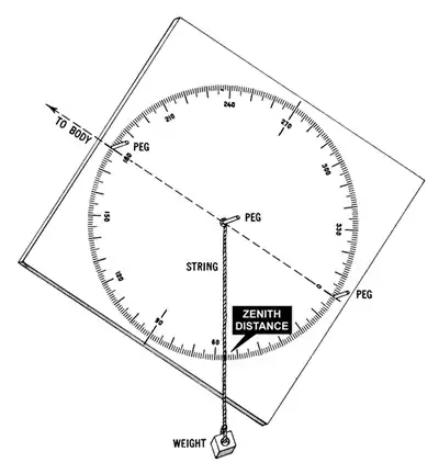 Two pegs or nails can be mounted perpendicular to a board, with a weight hung from the one farther from the eye. The board is held vertically and the two pegs aligned with the body being observed. A finger is then placed over the string holding the weight, to keep it in position as the board is turned on its side. A perpendicular line is dropped from the peg nearer the eye, to the string. The body’s altitude is the acute angle nearer the eye. For alternate readings of a series, the board should be inverted. Graduations consist of a series of marks indicating the position of the string at various altitudes.