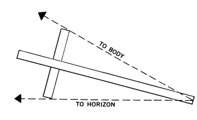 A rule or any stick can be held at arm’s length. The top of the rule is placed in line with the celestial body being observed, and the top of the thumb is placed in line with the horizon. The rule is held vertically. The length of rule above the thumb, divided by the distance from the eye to the top of the thumb, is the tangent of the angle observed. The cosine can be found by dividing the distance from the eye to the top of the thumb by the distance from the eye to the top of the rule. If the rule is tilted toward the eye until the minimum of rule is used, the distance from the eye to the middle of the rule is substituted for the distance from the eye to the top of the thumb, half the length of the rule above the thumb is used, and the angle found is multiplied by 2. Graduations consist of marks on the rule or stick indicating various altitudes. For the average observer each inch of rule will subtend an angle of about 2.3°, assuming an eye-to-ruler distance of 25 inches. This relationship is good to a maximum altitude of about 20°.