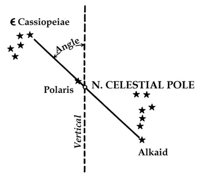 Figure 2611. Relative positions of ε Cassiopeiae, Polaris, and Alkaid with respect to the north celestial pole.
