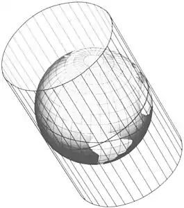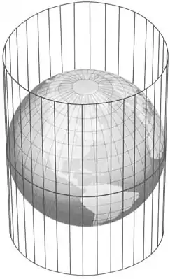 If a cylinder is placed around the earth, tangent along the equator, and the planes of the meridians are extended, they intersect the cylinder in a number of vertical lines. See Figure 304. These parallel lines of projection are equidistant from each other, unlike the terrestrial meridians from which they are derived which converge as the latitude increases. On the earth, parallels of latitude are perpendicular to the meridians, forming circles of progressively smaller diameter as the latitude increases. On the cylinder they are shown perpendicular to the projected meridians, but because a cylinder is everywhere of the same diameter, the projected parallels are all the same size.