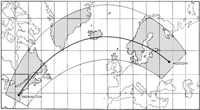 Figure 309d. An oblique Mercator map based upon a cylinder tangent along the great circle through Washington and Moscow. The map includes an area 500 miles on each side of the great circle. The limits of this map are indicated on the Mercator map of Figure 309c.