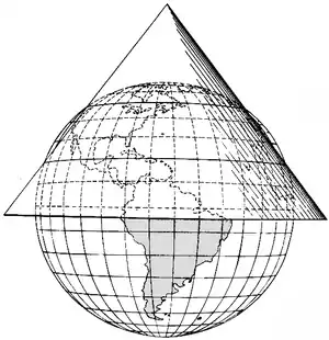 In a simple conic projection, points on the surface of the earth are transferred to a tangent cone. In the Lambert conformal projection, the cone intersects the earth (a secant cone) at two small circles. In a polyconic projection, a series of tangent cones is used.