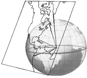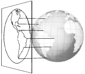 If a plane is tangent to the earth, and points are projected geometrically from the center of the earth, the result is a gnomonic projection. See Figure 316a. Since the projection is perspective, it can be demonstrated by placing a light at the center of a transparent terrestrial globe and holding a flat surface tangent to the sphere.