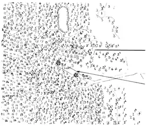 Directional ranges are indicated by a broken or solid line. The solid line, indicating that part of the range intended for navigation, may be broken at irregular intervals to avoid being drawn through soundings. That part of the range line drawn only to guide the eye to the objects to be kept in range is broken at regular intervals. The direction, if given, is expressed in degrees, clockwise from true north.