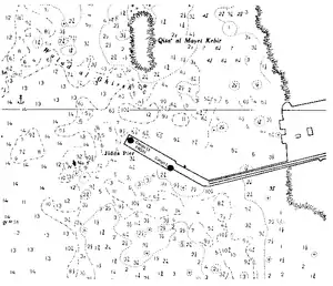 Several different symbols mark wrecks. The nature of the wreck or scale of the chart determines the correct symbol. A sunken wreck with less than 11 fathoms of water over it is considered dangerous and its symbol is surrounded by a dotted curve. The curve is omitted if the wreck is deeper than 11 fathoms. The safe clearance over a wreck, if known, is indicated by a standard sounding number placed at the wreck. If this depth was determined by a wire drag, the sounding is underscored by the wire drag symbol. An unsurveyed wreck over which the exact depth is unknown but a safe clearance depth is known is depicted with a solid line above the symbol. Tide rips, eddies, and kelp are shown by symbol or legend. Piles, dolphins (clusters of piles), snags, and stumps are shown by small circles and a label identifying the type of obstruction. If such dangers are submerged, the letters “Subm” precede the label. Fish stakes and traps are shown when known to be permanent or hazardous to navigation.