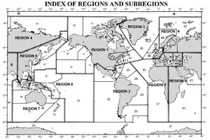 Two- and three-digit numbers are assigned to those small-scale charts which depict a major portion of an ocean basin or a large area. The first digit identifies the applicable ocean basin. See Figure 343a. Two-digit numbers are used for charts of scale 1:9,000,000 and smaller. Three-digit numbers are used for charts of scale 1:2,000,000 to 1:9,000,000.