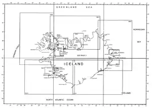 Figure 343c. Chart coverage of Iceland, illustrating the sequence and direction of the U.S. chart numbering system.