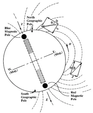 A narrow rod of soft iron, placed parallel to the Earth’s horizontal magnetic field, H, will have a north pole induced in the end toward the north geographic pole and a south pole induced in the end toward the south geographic pole. This same rod in a horizontal plane, but at right angles to the horizontal Earth’s field, would have no magnetism induced in it, because its alignment in the magnetic field precludes linear magnetization, if the rod is of negligible cross section. Should the rod be aligned in some horizontal direction between those headings which create maximum and zero induction, it would be induced by an amount which is a function of the angle of alignment. However, if a similar rod is placed in a vertical position in northern latitudes so as to be aligned with the vertical Earth’s field Z, it will have a south pole induced at the upper end and a north pole induced at the lower end. These polarities of vertical induced magnetization will be reversed in southern latitudes.