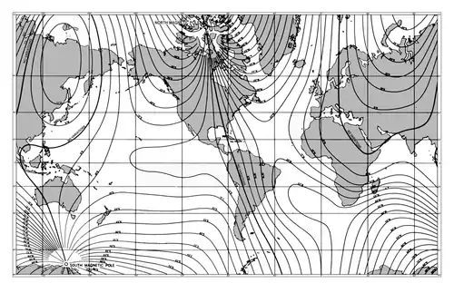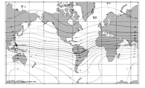 The poles are not geographically static. They are known to migrate slowly, so that variation for most areas undergoes a small annual change, the amount of which is also noted on charts. Figure 602b and Figure 602c show magnetic dip and variation for the world. Up-to-date information on geomagnetics is available at http://geomag.usgs.gov.