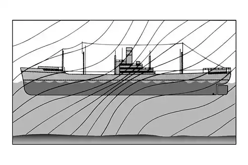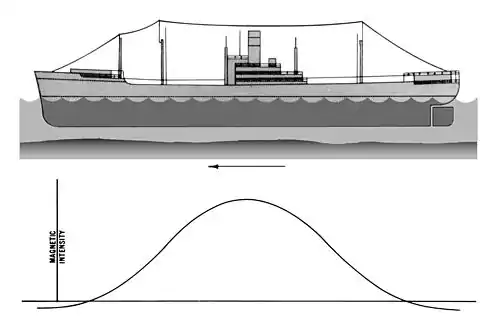 A ship, then, has a combination of permanent, subpermanent, and induced magnetism. Therefore, the ship’s apparent permanent magnetic condition is subject to change from deperming, shocks, welding, and vibration. The ship’s induced magnetism will vary with the Earth’s magnetic field strength and with the alignment of the ship in that field.
