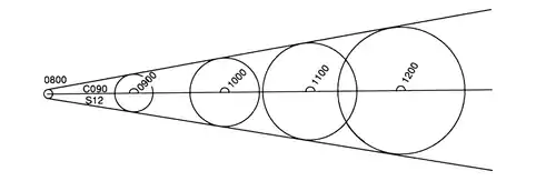 First, enclose the fix position in a circle, the radius of which is equal to the accuracy of the system used to obtain the fix. Next, lay out the ordered course and speed from the fix position. Then apply the fix expansion circle to the hourly DR’s, increasing the radius of the circle by the error factor each time. In the example given above, the DR after one hour would be enclosed by a circle of radius 2.5 nm, after two hours 4.5 nm, and so on. Having encircled the four hour DR positions with the error circles, the navigator then draws two lines originating tangent to the original error circle and simultaneously tangent to the other error circles. The navigator then closely examines the area between the two tangent lines for hazards to navigation. This technique is illustrated in Figure 705.
