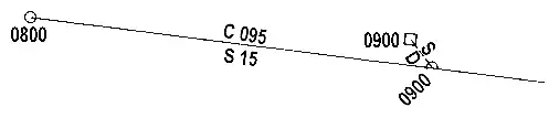 Figure 702 illustrates this process. The navigator plots and labels the 0800 fix. The conning officer orders a course of 095°T and a speed of 15 knots. The navigator extends the course line from the 0800 fix in a direction of 095°T. He calculates that in one hour at 15 knots he will travel 15 nautical miles. He measures 15 nautical miles from the 0800 fix position along the course line and marks that point on the course line with a semicircle. He labels this DR with the time. Note that, by convention, he labels the fix time horizontally and the DR time diagonally.