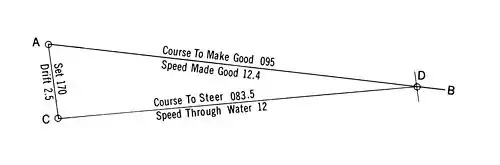 Using C as a center, swing an arc of radius CD, the speed through the water (12 knots), intersecting line AB at D.