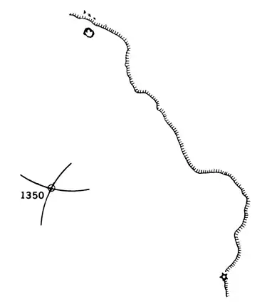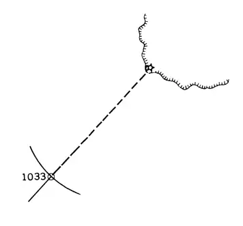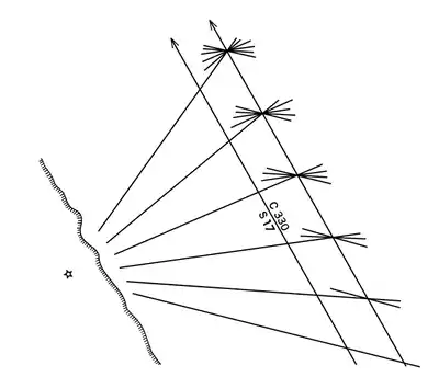 Figure 802d. A danger bearing, hatched on the dangerous side, labeled with the appropriate bearing.