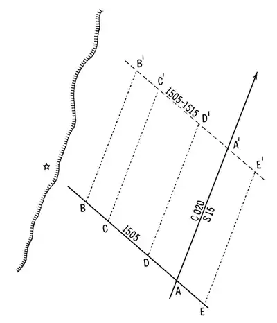 - At a perpendicular distance of 350 yards, the transfer, draw a line A'B' parallel to the original course line AB. The point of intersection, C, of A'B' with the new course line is the place at which the turn is to be completed.