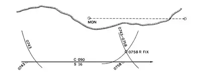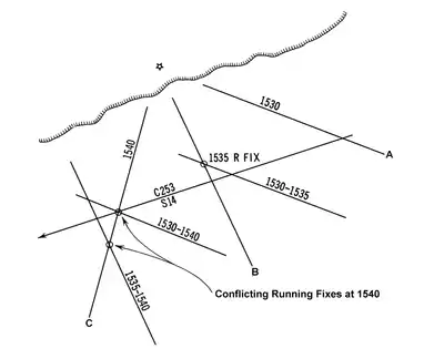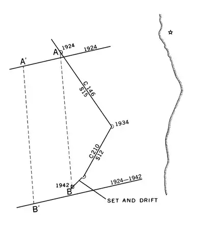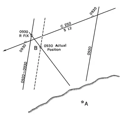 Figure 820a. Detecting the existence of an oblique current, by a series of running fixes.