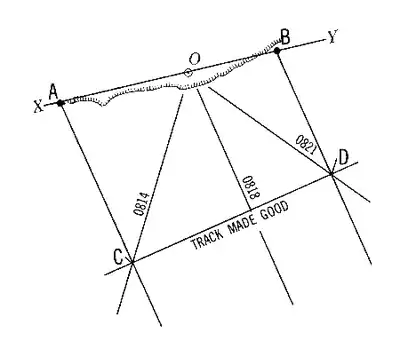 Whatever the current, the navigator can determine the direction of the track made good (assuming constant current and constant course and speed). Observe and plot three bearings of a charted object O. See Figure 820b. Through O draw XY in any direction. Using a convenient scale, determine points A and B so that OA and OB are proportional to the time intervals between the first and second bearings and the second and third bearings, respectively. From A and B draw lines parallel to the second bearing line, intersecting the first and third bearing lines at C and D, respectively. The direction of the line from C and D is the track made good.