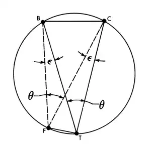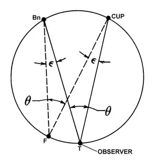 When measuring bearings from two NAVAIDS, the fix error resulting from an error held constant for both observations is minimized if the angle of intersection of the bearings is 90°. If the observer in Figure 823a is located at point T and the bearings of a beacon and cupola are observed and plotted without error, the intersection of the bearing lines lies on the circumference of a circle passing through the beacon, cupola, and the observer. With constant error, the angular difference between the bearings of the beacon and the cupola is not affected. Thus, the angle formed at point F by the bearing lines plotted with constant error is equal to the angle formed at point T by the bearing lines plotted without error. From geometry it is known that angles having their apexes on the circumference of a circle and that are subtended by the same chord are equal. Since the angles at points T and F are equal and the angles are subtended by the same chord, the intersection at point F lies on the circumference of a circle passing through the beacon, cupola, and the observer.