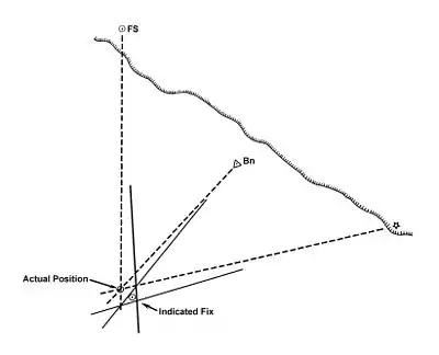 Assuming only constant error in the plot, the direction of displacement of the two-bearing fix from the position of the observer is in accordance with the sign (or direction) of the constant error. However, a third bearing is required to determine the direction of the constant error.
