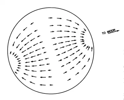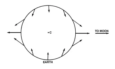 Figure 903a. Differential forces along a great circle connecting the sublunar point and antipode.